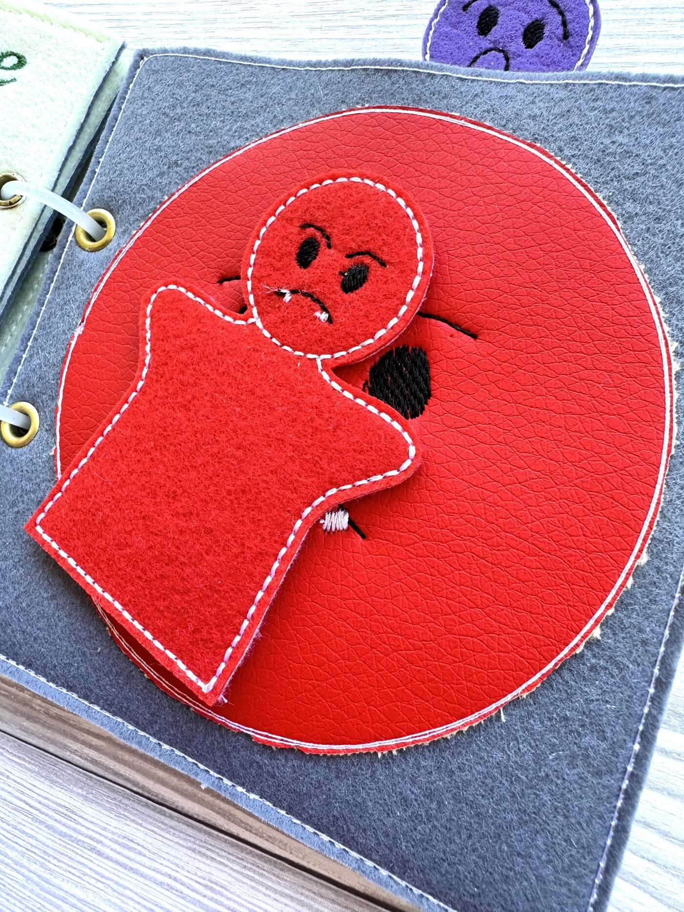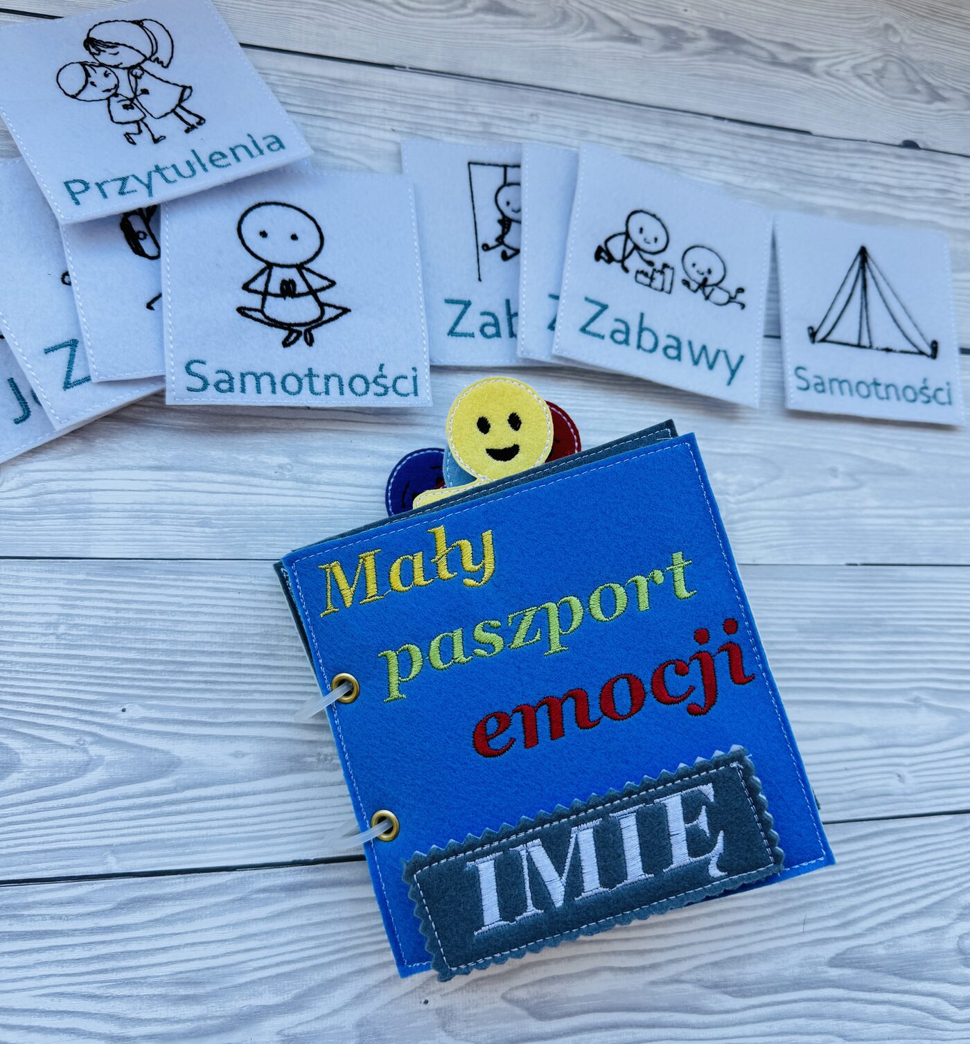 Dziecko poznaje emocje za pomocą kolorowych pacynkowych postaci i wyraźnych symboli emocji – każda strona to nowa mina, nowy kolor i nowa historia. Do każdej emocji dołączone są filcowe karty z potrzebami, które pomagają dziecku wyrazić to, co chciałoby w danej chwili. Całość można uzupełnić imieniem dziecka, tworząc osobisty, wyjątkowy zestaw.