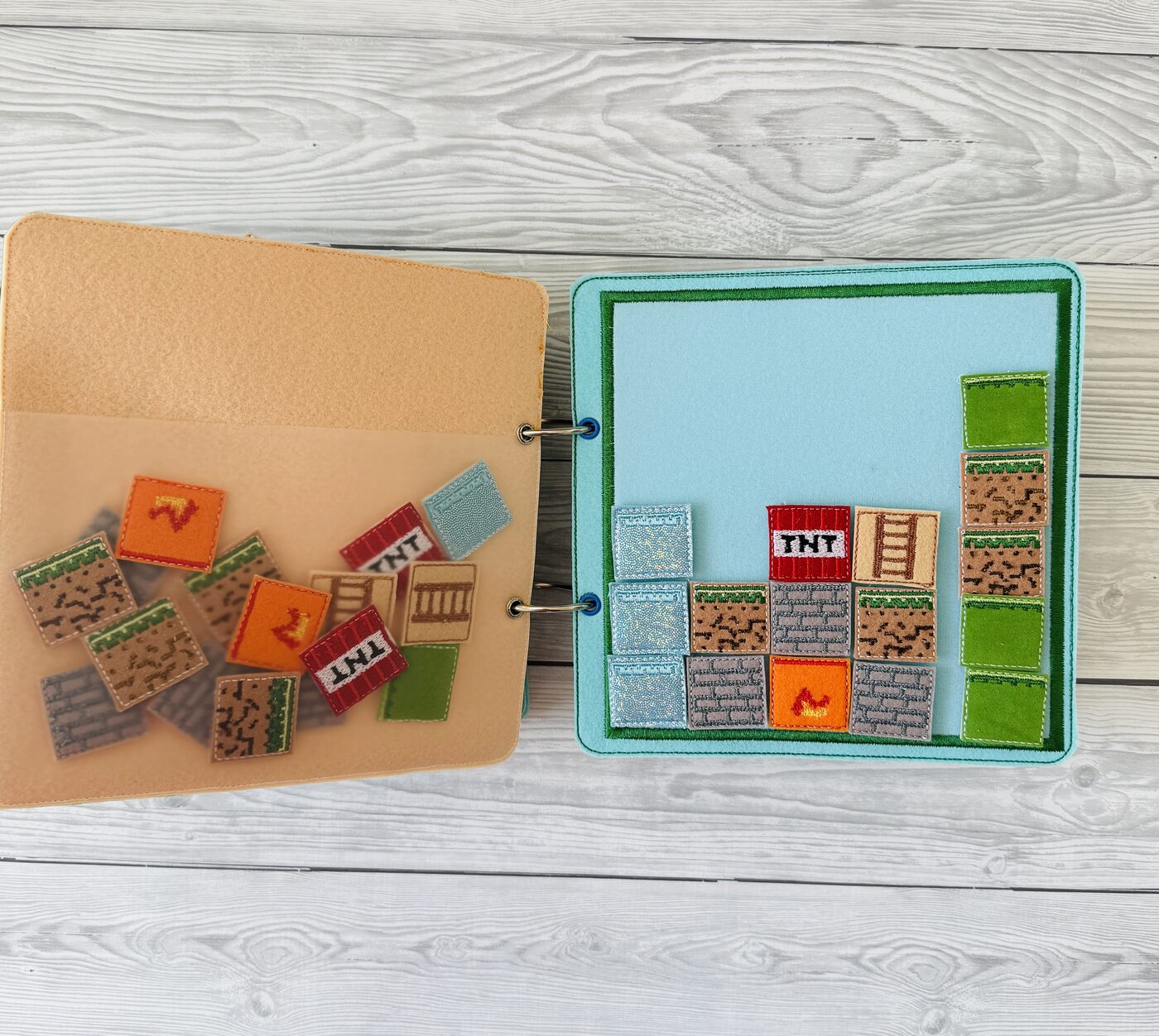 Strona przedstawia planszę w stylu pikselowej siatki, na której dziecko może dopasowywać kolorowe bloki w różnych kształtach i tworzyć własne układy. Elementy są mocowane na rzepy, co umożliwia wielokrotne zmienianie konfiguracji i zachęca do kreatywnego eksperymentowania. Zestaw zawiera zestaw bloków, które dziecko może układać według własnego pomysłu lub odwzorowywać określone wzory.